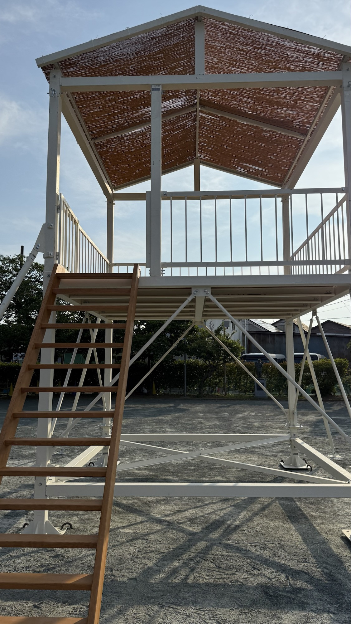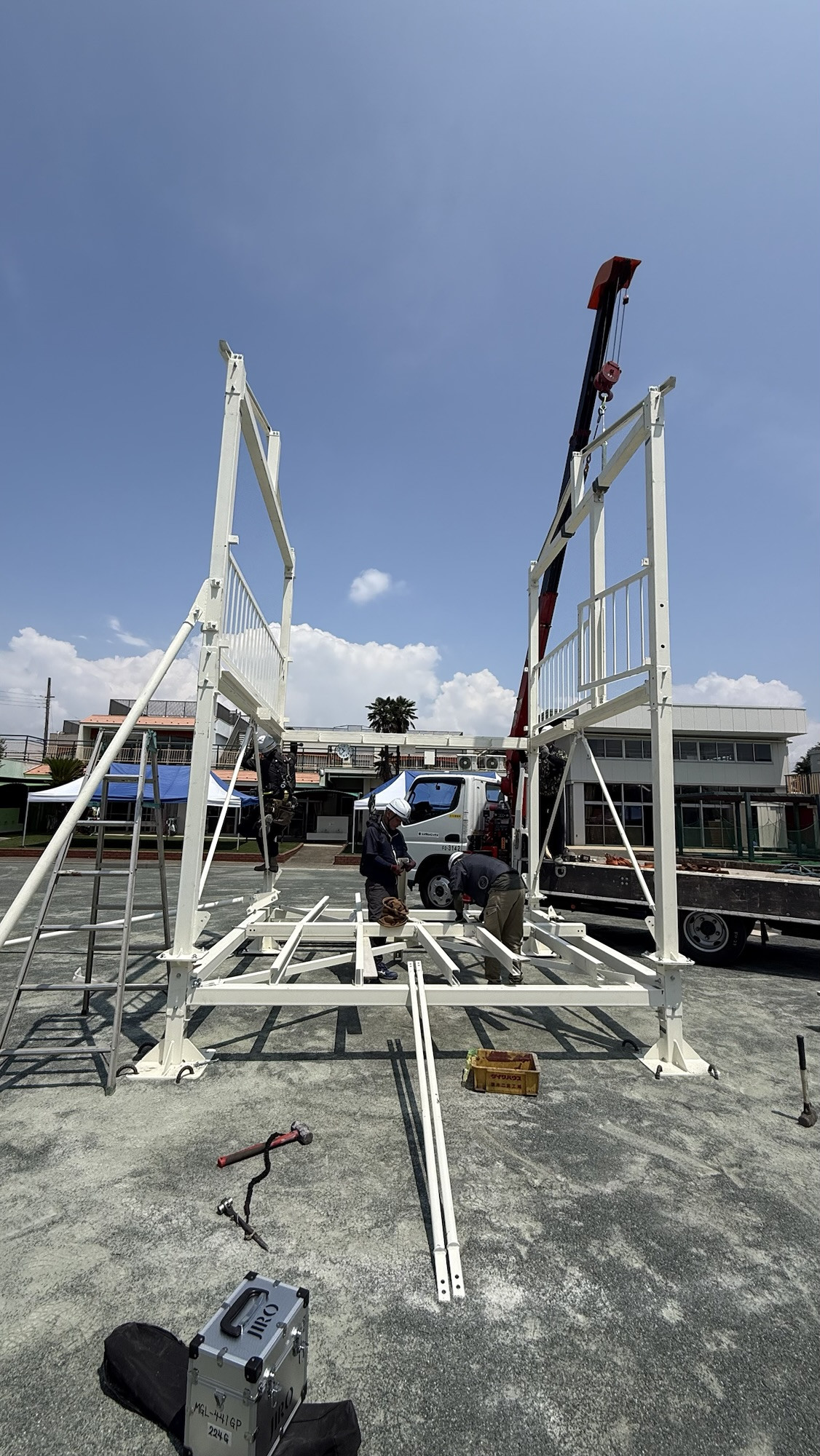 2025年7月3日午前、松本幼稚園様園庭にて搬入、組み立て開始。部材1本1本を丁寧に組み立てて行きます。