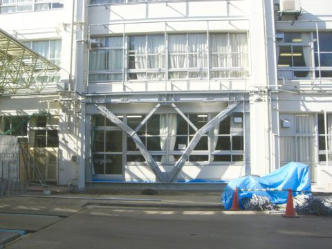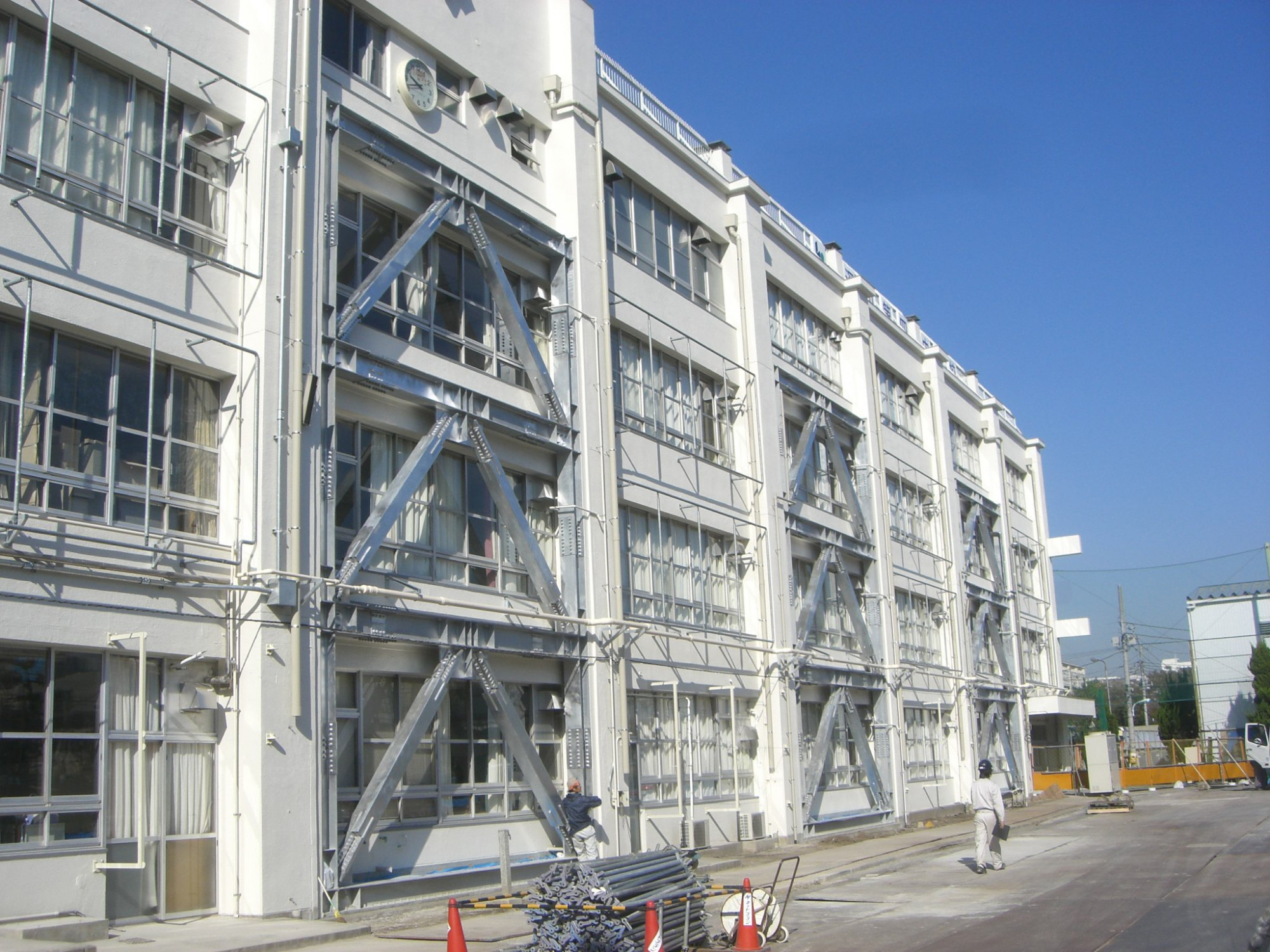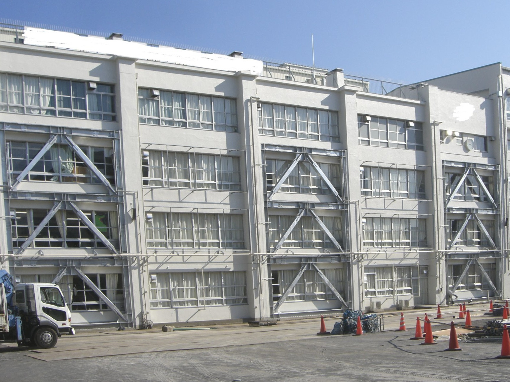 こちらは、外付け鉄骨ブレースの工場製作後及び出荷前の製品検査状況と現場での施工完了状況になります。 弊社では、協力業者として鉄骨ファブ(H、M、Rグレード)も有しており工場製作から現場施工まで鉄骨一式工事も請け負っております。